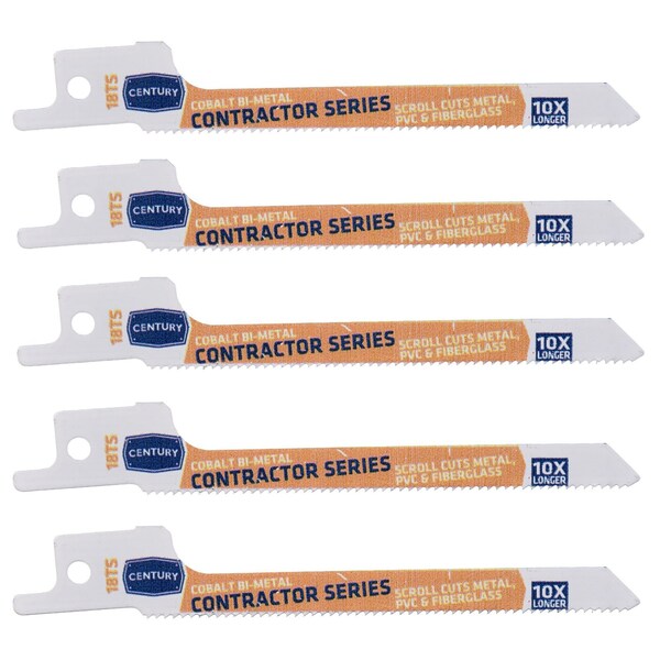 Century's Contractor Series Recip Blades lasts 10X longer when compared to standard carbon alloy blades. Unique nitro hardening process for optimal strength and blade life. Cobalt matrix teeth are fused to a flexible shatterproof shock absorbing alloy backbone for rugged cutting. 1/2" universal shank fits all popular reciprocating saws. 4" overall length. 5-PACK