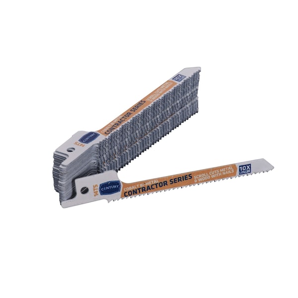 Century's Contractor Series Recip Blades lasts 10X longer when compared to standard carbon alloy blades. Unique nitro hardening process for optimal strength and blade life. Cobalt matrix teeth are fused to a flexible shatterproof shock absorbing alloy backbone for rugged cutting. 1/2" universal shank fits all popular reciprocating saws. 4" overall length. 25-PACK