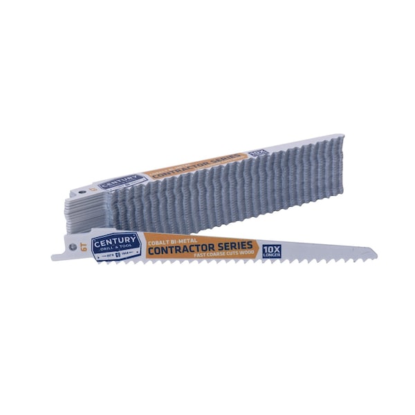 Century's Contractor Series Recip Blades lasts 10X longer when compared to standard carbon alloy blades. Unique nitro hardening process for optimal strength and blade life. Cobalt matrix teeth are fused to a flexible shatterproof shock absorbing alloy backbone for rugged cutting. 1/2" universal shank fits all popular reciprocating saws. 4" overall length. 25-PACK