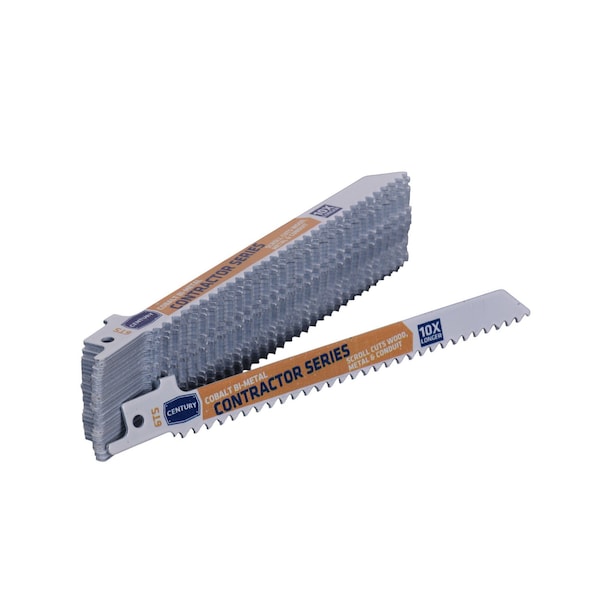 Century's Contractor Series Recip Blades lasts 10X longer when compared to standard carbon alloy blades. Unique nitro hardening process for optimal strength and blade life. Cobalt matrix teeth are fused to a flexible shatterproof shock absorbing alloy backbone for rugged cutting. 1/2" universal shank fits all popular reciprocating saws. 6" overall length. 25-PACK