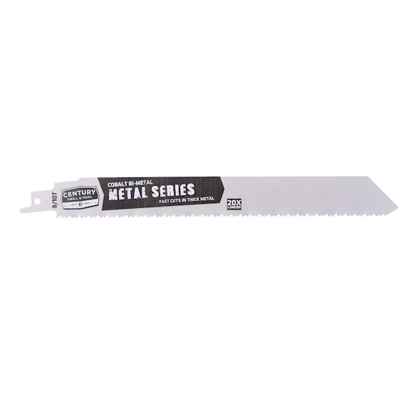 Century's Metal Series Recip Blades last 20X longer when compared to standard bi-metal blades in metal applications. Unique nitro hardening process for optimal strength and blade life. Cobalt matrix teeth are fused to a flexible shatterproof shock absorbing alloy backbone for rugged cutting. 1" width and heavy duty blade thickness for clean cuts with less vibration in heavy metal cutting applications. 1/2" universal shank with 5% tilt angle for faster cuts and skid free starts. 8" overall length. 25-PACK