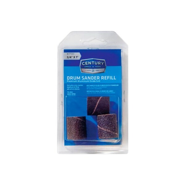 Century drill 77120 - drum sander 3pc refill -1/4" shank - 3/4 x 1" drum sander 3pc refill. Aluminum oxide grit, bonded to a cloth back. Ideal for sanding wood, fiberglass and metal surfaces and edges. 1/4" shank fits all types of electric and cordless drills. 3pc refill includes one coarse, medium and fine abrasive sleeve.