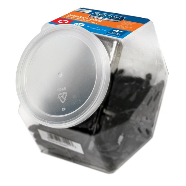 Century's Impact ProTM Screwdriving Bits are made from heat treated premium grade steel to ensure optimal performance in all applications. Century's patented heat treatment process provides maximum shock absorption associated with impact ready power tools. Precision ground tips for maximum contact and secure grip. Meets ANSI specifications. Black oxide coating resists corrosion and signifies that the accessory is impact rated. For use in standard and cordless impact drivers. Bulk Jar