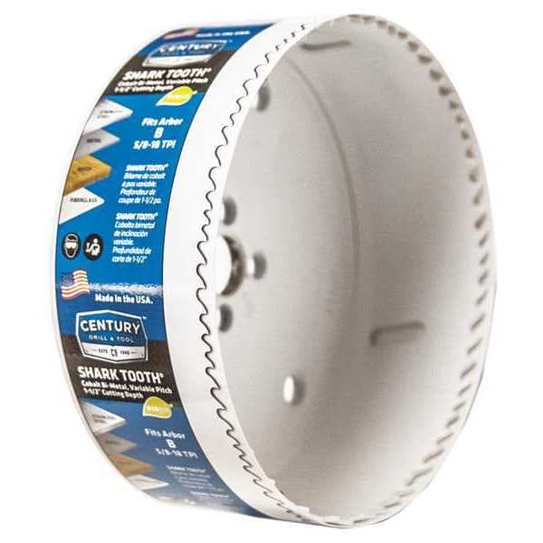Century's Shark Tooth® Hole Saws are professional bi-metal saws with 8% cobalt high speed steel teeth, electron welded to shatterproof shock absorbing alloy bodies. Shark Tooth’s variable pitch tooth pattern cuts clean through stainless steel, brass, aluminum, pipe steel, nail embedded wood, hardwood, plywood, sheet metal, fiberglass, and plastic. Cuts up to 1-1/2" deep holes. Arbors sold separately.