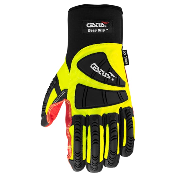 Deep Grip® gloves were designed to protect and add strong grip control for hands-on hazardous work sites. Flexible Thermoplastic Rubber (TPR) impact shields on the back of the glove add impact protection that bends with the fingers and offers continuous protection from finger tips to wrist. The palm features an oil-resistant, one-piece Skid-X Grip that is double stitched on with Kevlar®thread for strong grip control and durability. The neoprene long cuff covers the wrist while allowing the user to pull out of the glove if caught in a pinch or machinery.