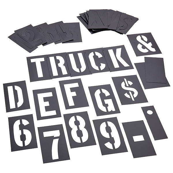 Stencil Set, Character Type Letter/Number Set, Duty Light, FAA AC 150/5340-1K Compliant No, Font Gothic, Included Characters, Messages, and Symbols 0 to 9, A to Z, Ampersand (&), Dash (-), Dollar Sign ($), Period (.), Includes Large Space, Small Space, Individual Character Height 4 in, Individual Character Width Not Applicable, Interlocking Yes, Interlocking Orientation Horizontal, Material PVC, Message or Symbol Height 4 in, Message or Symbol Width Not Applicable, MUTCD Compliant No