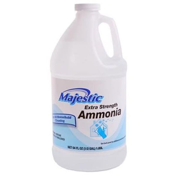 Majestic Extra Strength Regular Ammonia is great for all household cleaning. Cleans linoleum and vinyl floors, ceramic or plastic tile, painted walls and woodwork, windows and mirrors, cures stale odors, use in laundry, diapers, and fine fabrics. Net wt 64oz. 8 bottles per case.