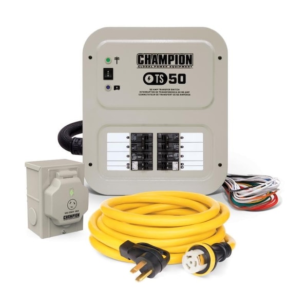 Transfer Switch, Phase Single, Rated Voltage 240V AC, Current Rating 50 A, Number of Spaces 10, Prewired Yes, NEMA Enclosure Rating 1, 3R, Includes 30-Foot Heavy-Duty Generator Power Cord, Weather-Resistant Outdoor Mounted Power Inlet Box, Overall Height 17 5/8 in, Overall Width 15 5/16 in, Overall Depth 4 3/8 in, Compatible with Brand Champion, Ground Bar Kit 09101-00108-0000, Maximum Number of Tandem Breakers 2, Maximum Wire Size 10 AWG, Minimum Wire Size 12 AWG