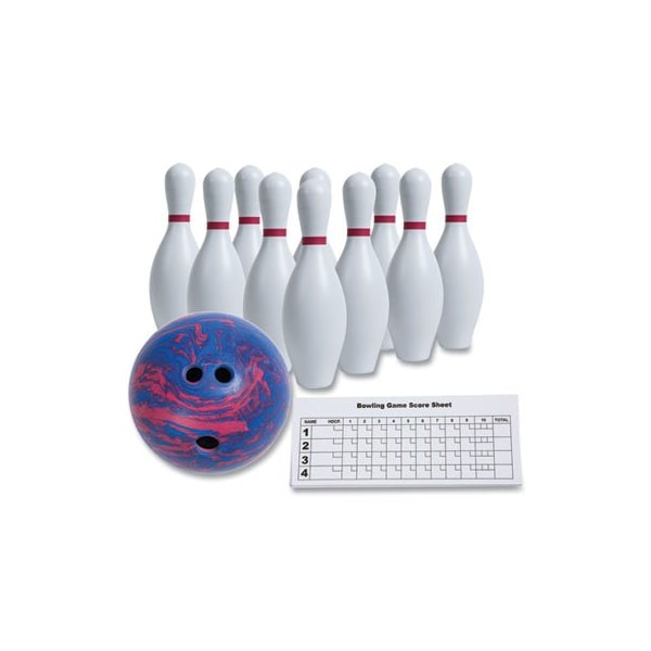 Lightweight ball and pins are easy for kids to move and set up. Rubber bowling ball knocks down pins outdoors, yet is still safe for indoor use. Pins are designed to last, even after hundreds of games. Includes one 4.5-lbs. blue/red rubber bowling ball and ten white plastic pins. Materials: Plastic Pins; Rubber Ball; Playground/Gymnasium Sets Type: Bowling.