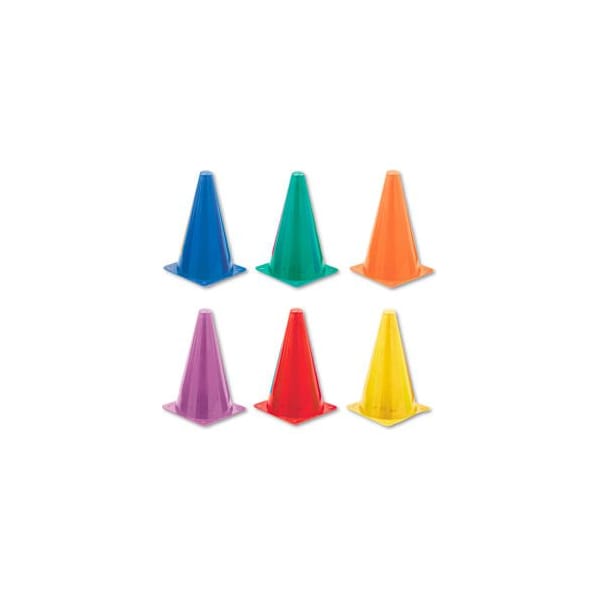 Cones are bright and colorful for easy visibility -- even at night! Each 9in cone is made of durable plastic. Cones stack easily for quick storage that saves space. Set includes one each blue, green, orange, purple, red and yellow. Six cones per set. Materials: Plastic; Playground/Gymnasium Sets Type: Cone.