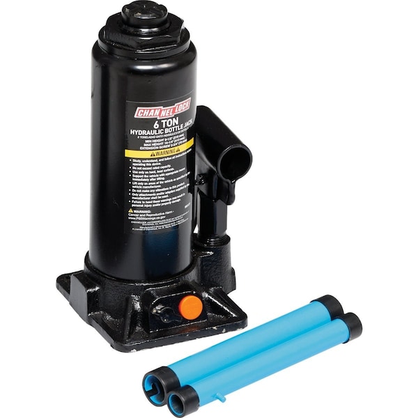 Channellock hydraulic bottle jack ideal for auto truck service farm and shop use. This bottle jack features a heavy-duty base and is designed to withstand the toughest jobs.