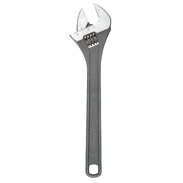 Adjustable Wrench, Alloy Steel, Black Phosphate, 15 in, Jaw Capacity 1 1/2 in, Plain, Ergonomic, Self-Adjusting, Measuring Scale Yes, Insulated No, Nonsparking No