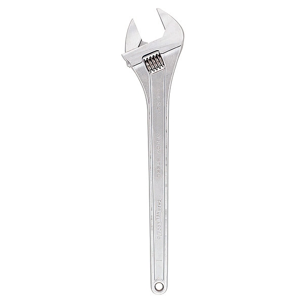 This Chanellock 24" Adjustable Wrench has a 4-thread knurl that makes it easy to adjust the jaws. It is made of alloy steel and has a chrome finish. With an ergonomic handle, this adjustable wrench provides excellent grip. The 2 7/16 in jaw capacity means you can use this wrench on many different types of fasteners. This tool has a plain jaw style, which allows for quick adjustment with just one hand. Made of alloy steel, the head thickness is 1 5/16 in., while the overall length is 24 in.. The Chanellock 824 Adjustable Wrench will get your job done quickly and efficiently.