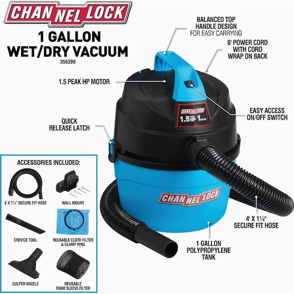 Introducing the Channellock Micro 1 Gal. Wet/Dry Vacuum your go-to tool for tackling messes big and small. Despite its compact size this 1.5 HP powerhouse delivers exceptional cleaning performance on both wet and dry debris. Designed for convenience and portability it features a strong handle for easy carrying and a 6 Ft. power cord with a practical cord wrap system. This vacuum doesnt just perform; it comes packed with essential accessories including a 1-1/4 In. x 4 Ft. hose crevice and gulper nozzles for those hard-to-reach areas a wall mount for space-saving storage and both foam and reusable cloth filters to suit any task. Whether youre cleaning your workshop vehicle or home the Channellock Micro Wet/Dry Vacuum offers the versatility and power you need in a compact durable package.