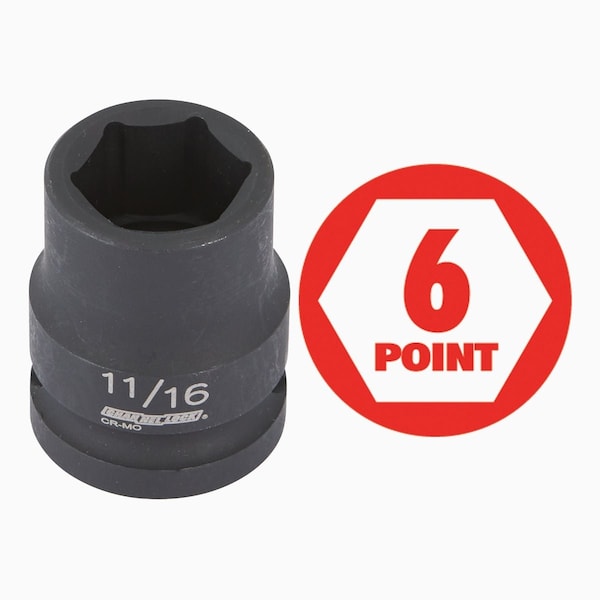 6-point sockets offer more surface area making them less likely to slip off or round over corners. Chrome molybdenum steel with black oxide finish. Includes sizes: 7/16 1/2 9/16 5/8 11/16 3/4 13/16 7/8. Plastic storage rack.