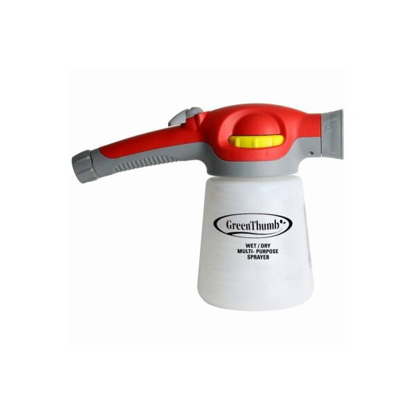 Green Thumb Wet Dry Multi Purpose Hose End Sprayer Thumb Control On Off Wet Dry Select Dial In your application in ounces, tablespoons and teaspoons, Internal Filter Basket, 4 Spray Patterns for added Control, 32 oz capacity, Internal Back Flow preventer, Ergonomic handle