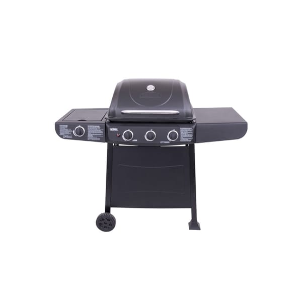 The Thermos 3-Burner Gas Grill features 36,000 BTUs of cooking power spread across 370 square inches of primary cooking space. Stainless steel burners are rust-resistant and the porcelain-coated grates keep food from sticking and are easy to clean. Equipped with a 12,000 BTU side burner, metal side shelves, built-in tool hooks for storage, a Piezo ignition system, and porcelain-coated steel lid & firebox designed to withstand the elements. This grill also features two 6 inch wheels and stationary legs for easy portability & stability -36,000 BTUs across 370 square inches of cooking space -Stainless steel burners are durable and rust-resistance -Porcelain-coasted grates keep food from sticking and are easy to clean -Metal side shelves for added food prep space -12,000 BTU side burner for added grilling versatility -Porcelain coated swing-a-way rack for 175 square inches of secondary cooking space -Piezo ignition for fast and reliable startups -Two 6 inch wheels for added portability - .