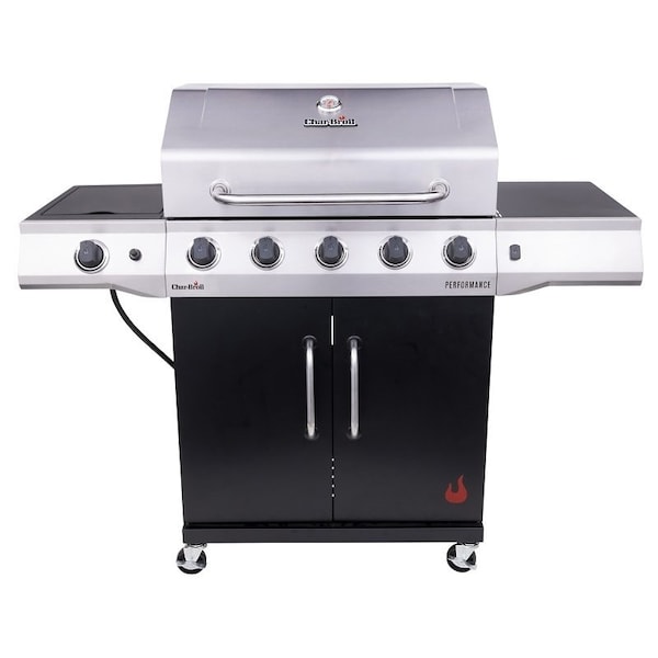 Char-Broil Gas Grill with Chef's Tray, Liquid Propane Gas, 495 sq-in Primary Cooking Surface Area, 2 ft 4 in Cooking Surface Width, 1 ft 5-3/32 in Cooking Surface Depth, 37,500 Btu, 5 Burners, Cast Iron Grate, Cabinet Storage Type, Electronic Ignition, Knob Control, Thermometer Included: Yes, Side Shelf Included: Yes, 900 deg F, Free-Standing Installation, Steel Body, Black/Silver, Dimensions: 3 ft 9-13/32 in H x 4 ft 5-11/16 in W x 1 ft 8-3/32 in D