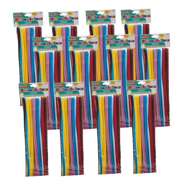 These jumbo 12 x 6mm stems are ideal for all arts and craft projects. Twist into any shape you can image. Colorful and soft, these fuzzy stems will add to any craft project. Assorted colors. Each pack includes 100 chenille stems. Sold as 12 packs for a total of 1200 chenille stems.