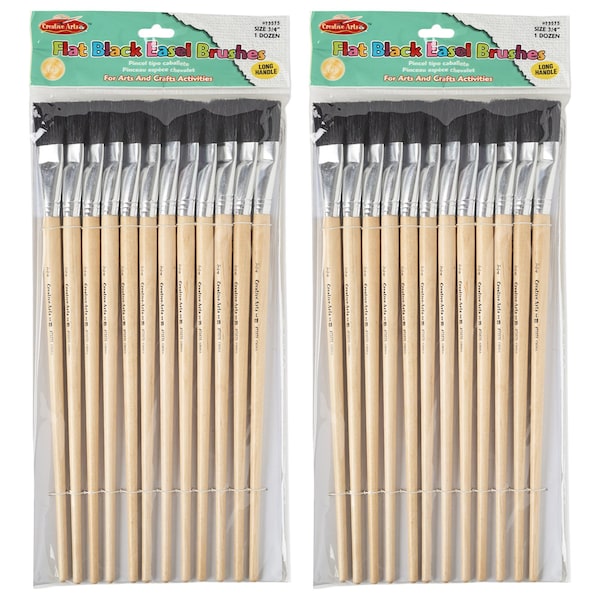 The flat easel paint brush is perfect for arts and crafts. The brush has black bristles, and is 3/4 inch wide. Each pack includes 12 brushes. Sold as 2 packs for a total of 24 brushes.