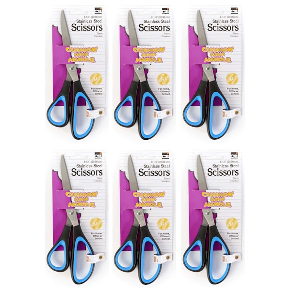 High quality soft grip stainless steel shears. Precision ground blades for consistently clean cutting. Comfortable molded plastic handles. 8-1/4 inch bent. Pack of 6 scissors.