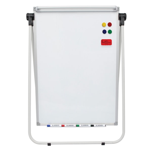 This foldable magnetic dry erase board is versatile and accommodating. Whether in the classroom, office or home, it can be adjusted to whatever your needs may be. Double-sided magnetic dry erase board rotates a full 360 degrees. You can easily position the board into a landscape position to use as a temporary desk or use in a display position for meetings or front of the classroom. The height can also be adjusted from 40'' to 74'' to easily accommodate any viewing audience. Features a clamp and hooks for hanging presentation pads or flip charts. The sturdy aluminum frame with ABS corners protects edges of board. The anti-slip rubber feet will keep the board sturdy and stable when writing or erasing. Board also includes, four low odor chisel tip dry erase markers, four button style markers and a magnetic eraser to make this an all in one set! Foldable metal frame makes it easy to use and carry, no assembly required. Markers are AP Certified.