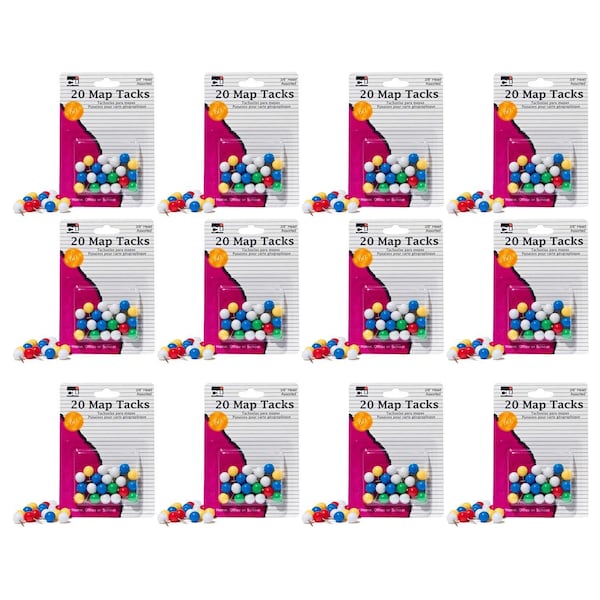 Map tacks feature 3/8" solid plastic heads with rust resistant steel pins. Ideal for pin pointing map locations. Each pack includes 20 tacks in assorted colors. Sold as 12 packs for a total of 240 tacks.