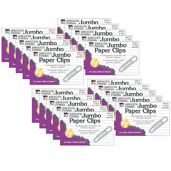 High quality gem clips drawn from the finest steel wire. Made to commercial specifications. Rust-resistant and smooth finish. Each box includes 100 jumbo paper clips. Sold as 20 boxes for a total of 2000 jumbo paper clips.