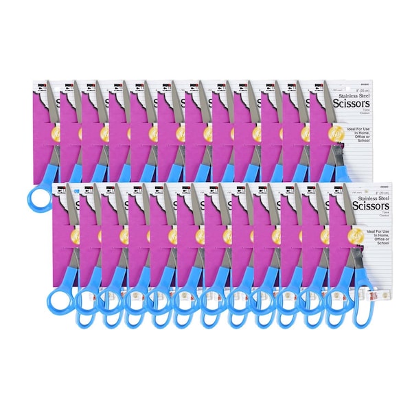 These high quality stainless steel scissors feature comfortable molded plastic handles and precision-ground blades for consistently clean cutting. Great for school, home or office. Stainless Steel Scissors with 8 inch straight blade length. Comfortable molded plastic handles. Pack of 24 scissors.