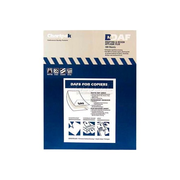 Chartpak applique drafting film, daf8, permanent, 11"l x 8-1/2"w, 100/box this 1.5 mil drafting applique film with matte finish helps save time when any application needs to be drafted or drawn multiple times. The matte surface gives top-quality images using copiers, laser printers, computer printers, typewriters, pencil or ink. Ideal for diazo reproduction. Polyester drafting film will not yellow with age. Use with copiers and printers.
