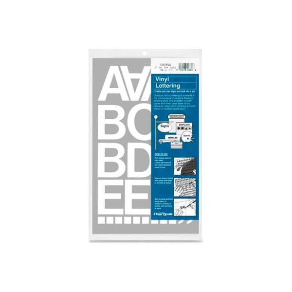 Chartpak vinyl numbers/letters, 2"h, white easily apply these 2" vinyl numbers and letters to clean dry surfaces, indoors and outdoors. Ideal for displays, signs, posters and equipment identification. Helvetica style letters and numbers have self-adhesive backings. Set includes uppercase letters from a to z, numbers from 0 to 9 (one each), and symbols: 54 periods, 14 commas, 21 dashes, six asterisks, one dollar sign, one cent sign, one question mark and one exclamation point.