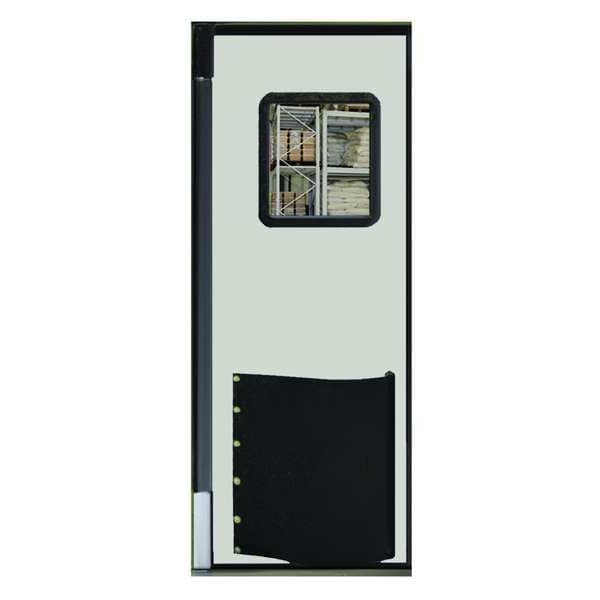 Swinging Door, Door Height 7 ft, Door Width 2 1/2 ft, Door Color Gray, Swinging Door Material Polyethylene, Textured Finish, Door Thickness 1 1/2 in, Number of Doors 1, Window Height 18 in, Window Width 12 in, Bumpers Included Yes, Door Seals Included Yes, Opening Height 7 ft, Opening Width 2 ft 6 in, Window Color Clear, Window Material Polycarbonate, Left and Right Jamb, Insulation Value 9.86, Standards USDA, Swinging Door Core Material Non-CFC Urethane Core, Window Included Yes