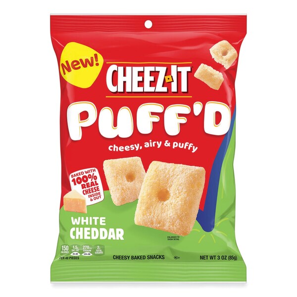 Taste the fun of puffy and airy bite-size squares baked with 100% real cheese inside and out. This snack satisfies your senses with an irresistible crunch followed by melt-in-your-mouth cheesiness that everyone is sure to crave. Baked with 100% real cheese in every puffy cracker for maximum tastiness. Grab a pouch for a fun and light meal, an afternoon pick-me-up or on-the-go bite. Enjoy the crisp, crunchable, and always munchable Cheez-It Puff'd cheesy baked snack.