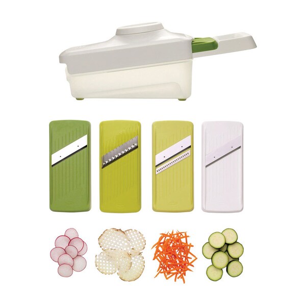 Box mandoline includes thick and thin straight blade decks and julienne and waffle blade decks.