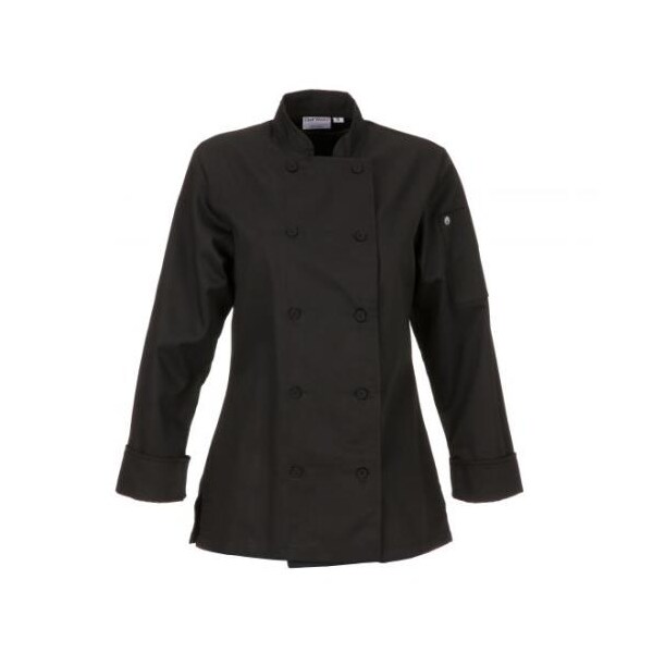 Women's small sized chef coat; 6.2 oz 65/35 poly/cotton twill; Feminine cut; Cloth-covered buttons; Side seam slit; Turned back cuffs; Thermometer pocket