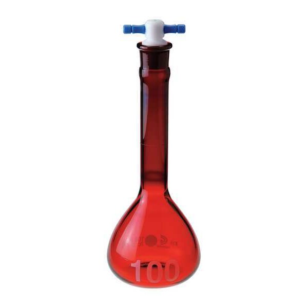 Volumetric Flask, Capacity - Metric 100 mL, Capacity - English 3.38 fl oz, Flask Type Volumetric, Overall Height - Metric 180 mm, USP Specification Type I, Tolerance +/-0.10 mL, Includes Closure Yes, Closure Type Stopper, Neck Style Straight, Closure Material PTFE, Compatible with Stopper Size 16, Sterile/Non-Sterile Non-Sterile, Autoclavable Yes, Body Color Red, Graduated No, Graduation Increments - Metric Not Applicable, Mouth Size Wide, Glassware Class A, ASTM Specification E288
