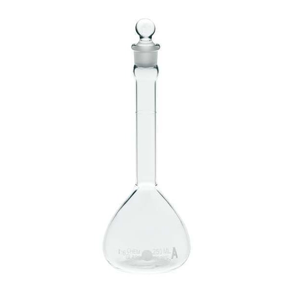 Volumetric Flask, Capacity - Metric 250 mL, Capacity - English 8.45 fl oz, Flask Type Volumetric, Overall Height - Metric 248 mm, USP Specification Type I, Tolerance 0.12 mL, Includes Closure Yes, Closure Type Stopper, Neck Style Straight, Closure Material Glass, Compatible with Stopper Size 16, Body Material Borosilicate Glass, Sterile/Non-Sterile Non-Sterile, Autoclavable Yes, Body Color Clear, Graduated No, Graduation Increments - Metric Not Applicable, Glassware Class A