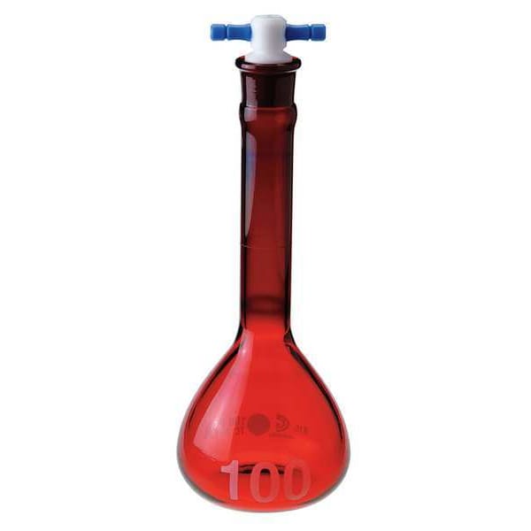 Volumetric Flask, Capacity - Metric 25 mL, Capacity - English 0.85 fl oz, Flask Type Volumetric, Overall Height - Metric 131 mm, USP Specification Type I, Tolerance +/-0.08 mL, Includes Closure Yes, Closure Type Stopper, Neck Style Straight, Closure Material PTFE, Compatible with Stopper Size 13, Sterile/Non-Sterile Non-Sterile, Autoclavable Yes, Body Color Red, Graduated No, Graduation Increments - Metric Not Applicable, Mouth Size Wide, Glassware Class A, ASTM Specification E288