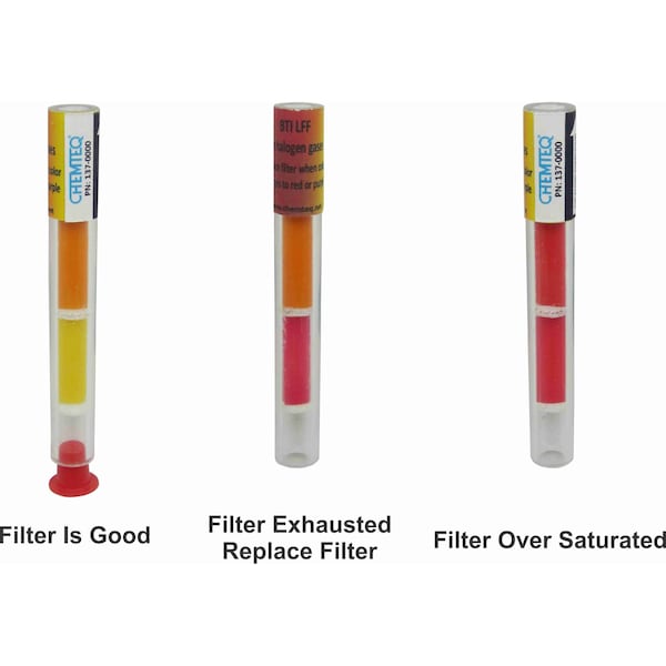 The Filter Change Indicator-Low-Flow Filters for Halogens Gases and Vapors (Halogens BTI LFF, PN: 137-0000) is qualitative (yes/no) colorimetric indicator for the saturation and end-of-service life of low-flow filters. It is designed to provide real-time indication of the breakthrough of halogens gases and vapors. Weight: 4.4g (0.16oz), Dimensions: 79mm (3.1in), diameter: 10mm (0.39in). Suitable for HPLC waste container and similar applications. To be used with closed pores filter outlet having a 3/8” centered opening. Please refer to document No. BTI LFF Leaflet MP-9155015-040721-D for details.
