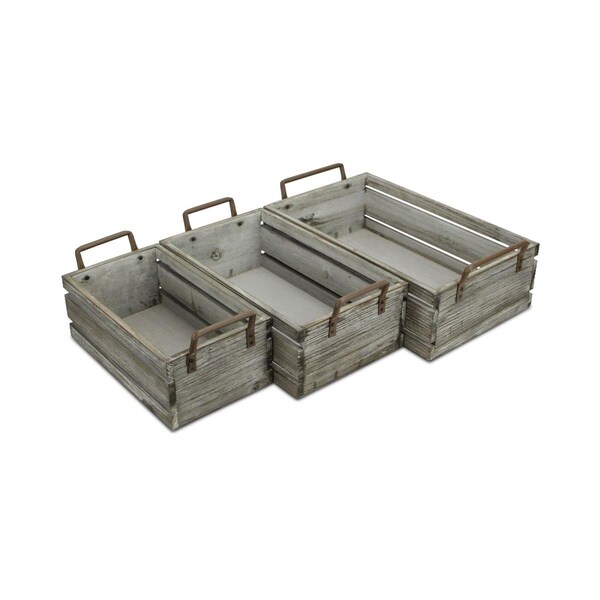 Brown Wood Grain Slatted Rectangular Small Crate with Side Handles - Set of 3