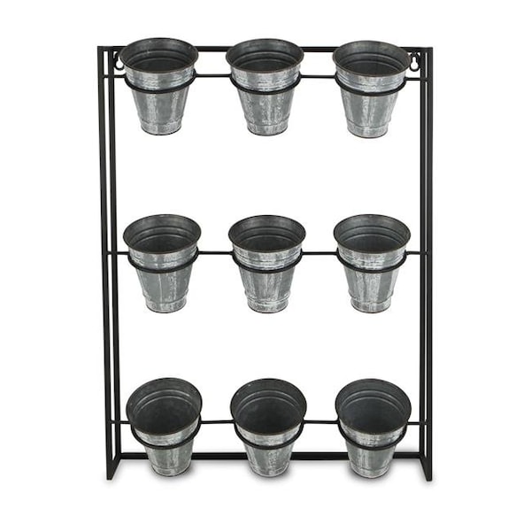 Tiered storage pieces are an eye-catching way to add life and functionality to a home or business. Perfect for storing various objects or for holding plants, these pieces maintain a variety of uses. This piece in particular features a 3 tier design with 3 galvanized pots in each row. It also incorporates an all metal construction along with rear hanging hooks to allow for wall placement if desired. Let this tiered stand add style and storage options to your home or office today.