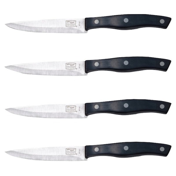 These classic triple-rivet steak knives from Chicago Cutlery feature a signature 26 deg taper grind edge designed for precise cutting and easy sharpening. The classic triple-rivet handle design provides a comfortable grip and the high-quality stainless steel blades resist stains.