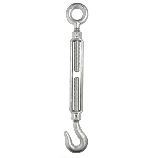 Turnbuckle, Turnbuckle Type Eye and Hook Turnbuckle, Body Material 1035 Steel, Working Load Limit 1,500 lb, Retracted Length 19 5/8 in, Take Up Length 12 in, Thread Diameter 1/2 in, Finish Galvanized, Fitting Material 1035 Hot Roll Steel, Standards F1145 Type 1 Grade 1