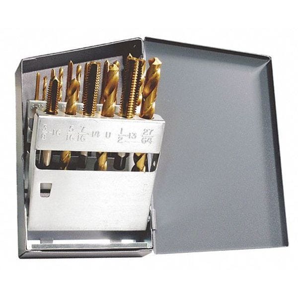 Drill Bit and Tap Set, Number of Pieces 18, Tap Type Plug Hand, Drill Bit Material High Speed Steel, Drill Bit Finish TiN, Drill Bit Dia. Included #21, #25, #29, #36, #7, 27/64 in, 5/16 in, F, U, Measurement System Fractional Inch, Impact Rated Not Impact Rated, Smallest Drill Bit Dia. #36