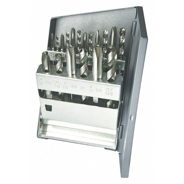 Drill Bit and Tap Set, Number of Pieces 18, Tap Type Spiral Point, Drill Bit Material High Speed Steel, Drill Bit Finish Bright (Uncoated), Drill Bit Dia. Included #21, #25, #29, #36, #7, 27/64 in, 5/16 in, F, U, Measurement System Fractional Inch, Impact Rated Not Impact Rated, Smallest Drill Bit Dia. #36