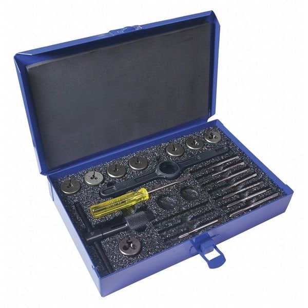 Tap and Die Set, Number of Pieces 19, Die Shape Round, Tap Type Hand Tap, Die Material Carbon Steel, Thread Sizes Included #0-80, #1-72, #10-24, #2-56, #3-48, #4-40, #6-32, #8-32, Die Thread Sizes Included #0-80 NF, #1-72 NF, #10-24 NC, #2-56 NC, #3-48 NC, #4-40 NC, #6-32 NC, #8-32 NC, Number Of Taps 8, Number of Dies in Set 8, Thread Standard UNC, UNF, Tap Shank Standard Table 302