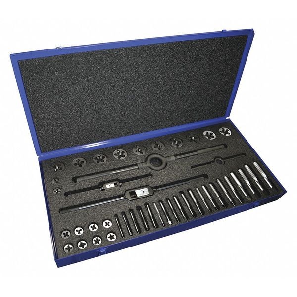 Tap and Die Set, Number of Pieces 44, Die Shape Round, Tap Type Hand Tap, Die Material Carbon Steel, Thread Sizes Included 1 In.-12, 1 In.-8, 1/2 In.-13, 1/2 In.-20, 1/4 In.-20, 1/4 In.-28, 3/4 In.-10, 3/4 In.-16, 3/8 In.-16, 3/8 In.-24, 5/16 In.-18, 5/16 In.-24, 5/8 In.-11, 5/8 In.-18, 7/16 In.-14, 7/16 In.-20, 7/8 In.-14, 7/8 In.-9, 9/16 In.-12, 9/16 In.-18