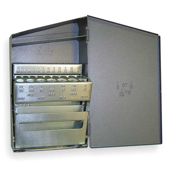 Drill Bit Case, Jobber Length, Holds 1/16 to 1/2 In Fractions by 64ths, Steel, Overall Case Width 4 9/64 In, Overall Case Depth 8 7/8 In, Overall Case Height 1 25/32 In, Number of Compartments 29, Drill Bits Not Included
