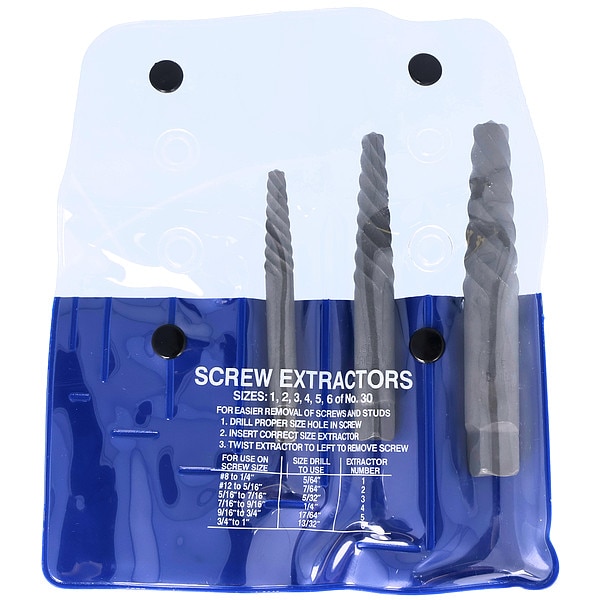 Screw Extractor Set, Extractor Type Spiral Flute Extractor, Number of Pieces 3, Drill Size 1/4 in, 13/32 in, 17/64 in, For Bolt Size 7/16 in to 1 in, Material - Machining Carbon Steel, Overall Length 3 in, 3 3/8 in, 3 3/4 in, Container Type Tube, Drive Type Square