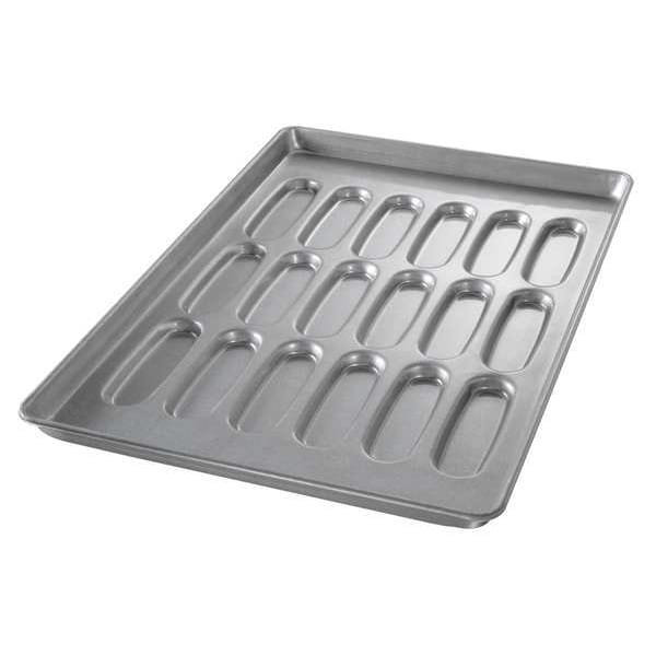 Bun and Roll Pan, Gauge 22 ga, Material Aluminized Steel, Dishwasher Safe No, Freezer Safe No, Oven Safe Yes, Color Shiny Gray, Overall Length 25 3/4 in, Overall Width 17 3/4 in, Overall Depth 1 5/8 in, NSF Certified No, Number of Slots 18, Pan Style Hot Dog Bun Pan